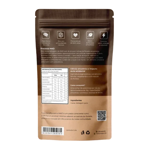 O Cacau Selvagem MAD é um cacau nativo da Amazônia, puro e sem aditivos. Produzido a partir de cacau selvagem, preserva o sabor intenso e o aroma marcante característicos do fruto em sua forma mais natural.Esse cacau é obtido por meio de práticas agroextrativistas realizadas por comunidades amazônicas, valorizando a floresta e promovendo uma produção regenerativa e sustentável. Seu perfil intenso e versátil o torna ideal para diversas preparações culinárias, desde bebidas até receitas doces ou salgadas.