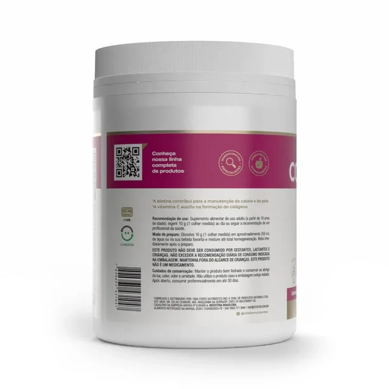 Cada porção fornece 9 g de peptídeos de colágeno e 10 mg de ácido ortosilícico, além de um complexo de micronutrientes que contribuem para a manutenção da pele, cabelos, unhas, ossos e metabolismo energético.