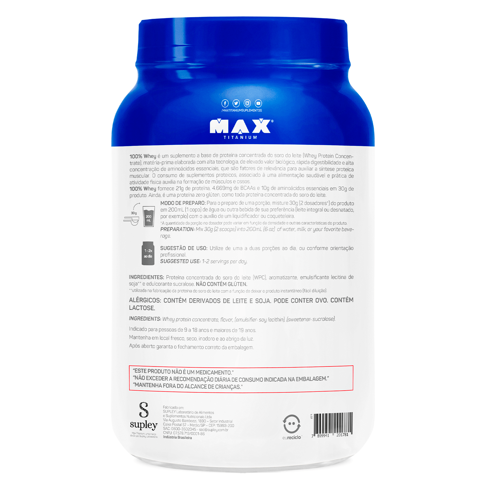 O 100% Whey Protein Concentrado da Max Titanium é um suplemento proteico desenvolvido para complementar a ingestão diária de proteínas de forma prática e eficiente. Produzido a partir da proteína concentrada do soro do leite (WPC), passa por um processo de filtração que preserva nutrientes importantes como proteínas, lactose e minerais.Cada porção fornece até 20 g de proteína, contribuindo para o aporte proteico necessário em rotinas de treino e atividades físicas. Sua fórmula apresenta baixo teor de gorduras e carboidratos, além de possuir textura cremosa e fácil dissolução, facilitando o preparo de shakes e receitas.