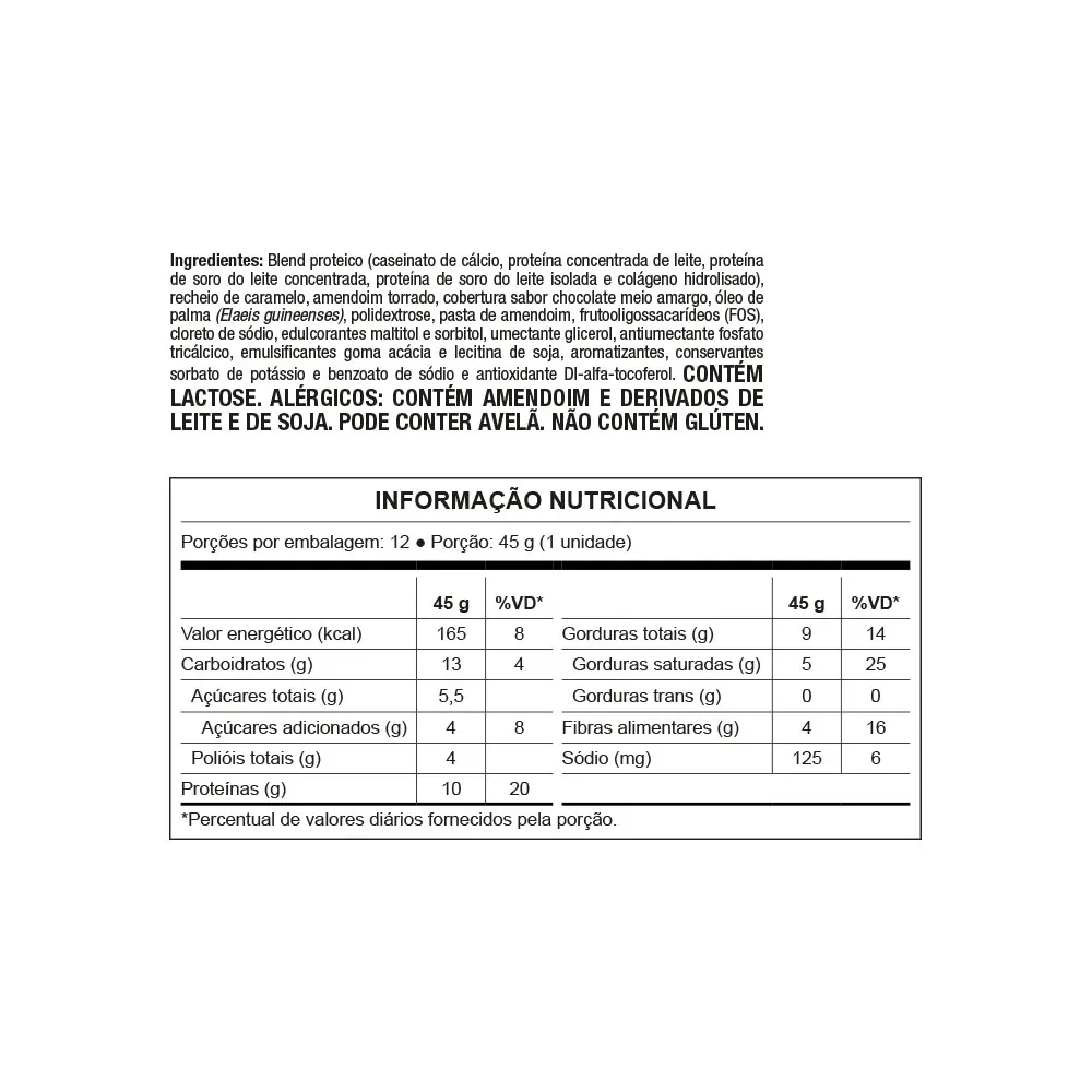 Blend proteico (caseinato de cálcio, proteína concentrada de leite, proteína de soro do leite concentrada, proteína de soro do leite isolada e colágeno hidrolisado), recheio de caramelo, amendoim torrado, cobertura sabor chocolate meio amargo, óleo de palma (Elaeis guineenses), polidextrose, pasta de amendoim, frutooligossacarídeos (FOS), cloreto de sódio, edulcorantes maltitol e sorbitol, umectante glicerol, antiumectante fosfato tricálcico, emulsificantes goma acácia e lecitina de soja, aromatizantes, conservantes sorbato de potássio e benzoato de sódio e antioxidante Dl-alfa-tocoferol.