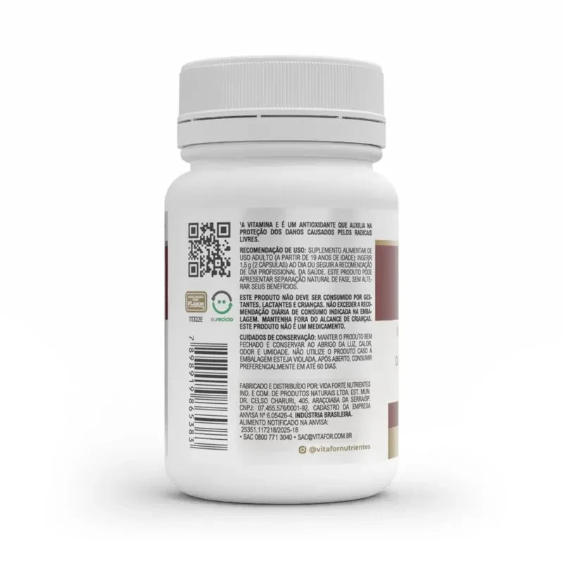 Sua fórmula é complementada com vitamina E, um nutriente com ação antioxidante, e apresentada em cápsulas de fácil consumo. A presença do MCT contribui para a composição do produto, tornando-o ainda mais funcional para o dia a dia.