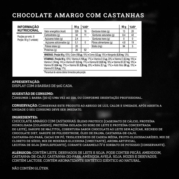 Barra proteica formulada com proteínas de alto valor biológico, combinadas a carboidratos de baixo índice glicêmico, fibras, TCM, vitaminas e minerais. Conta com castanhas na composição, agregando textura e sabor, além de contribuir para um perfil nutricional equilibrado. É uma opção prática para complementar a ingestão de nutrientes ao longo do dia.