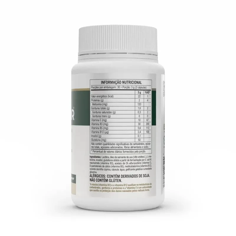 Com fórmula exclusiva Vitafor, oferece 120 mg de metionina e 50 mg de glutationa por porção, além de ser fonte de vitaminas essenciais. Apresenta-se em cápsulas softgel, é zero açúcares e não contém glúten.