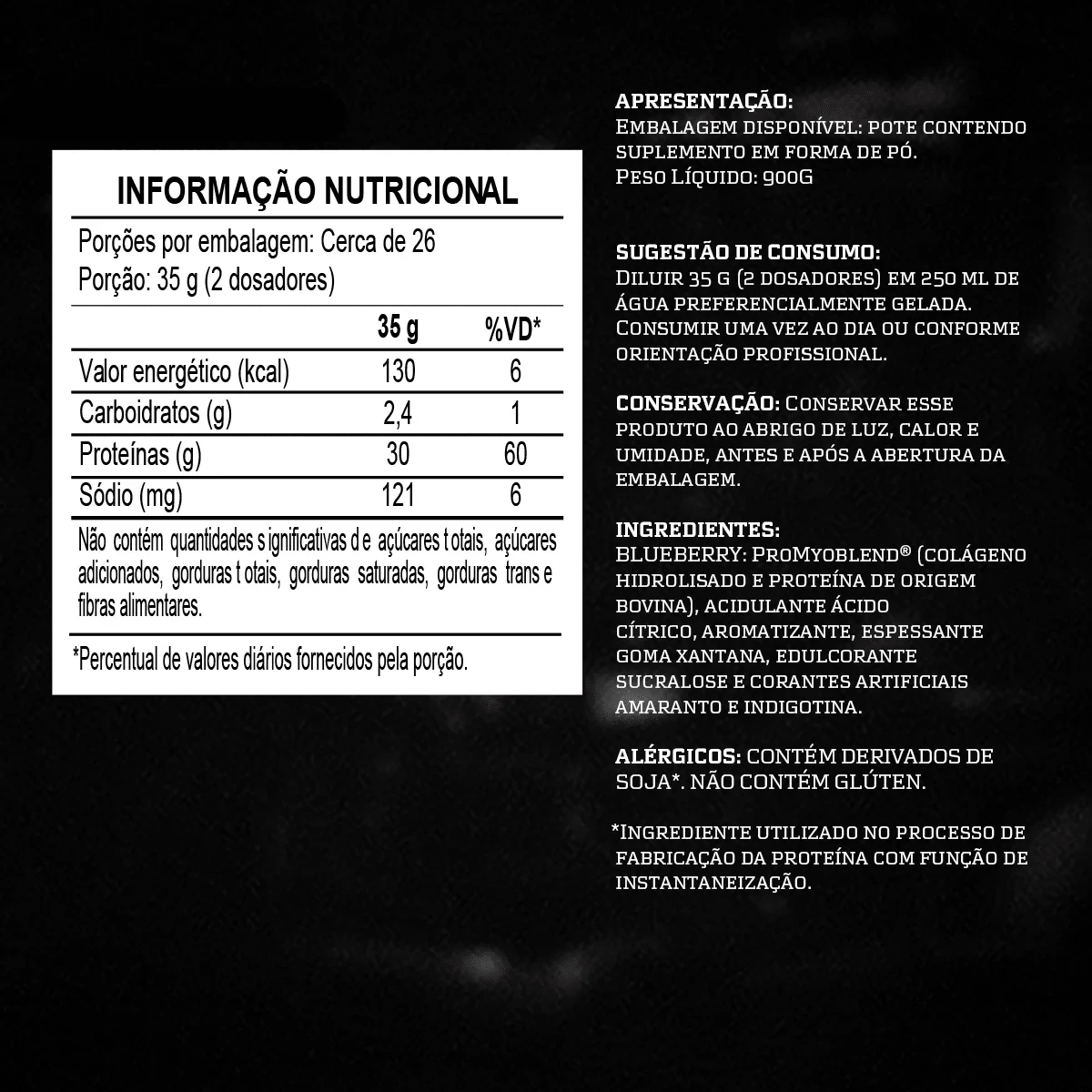 ProMyoblend® (colágeno hidrolisado e proteína de origem bovina), cacau em pó solúvel, aromatizantes, espessante goma xantana e edulcorante.