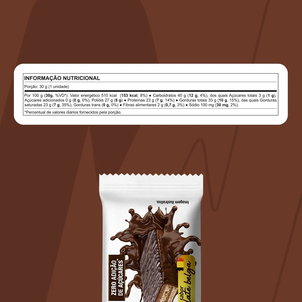 Proteína concentrada do soro de leite, gordura de palma, gordura vegetal, wafer (farinha de trigo enriquecida com ferro e ácido fólico, gordura vegetal, sal, lecitina de soja e fermento químico bicarbonato de sódio), cacau em pó, edulcorante maltitol, aromatizante, emulsificantes lecitina de soja e polirricinoleato de poliglicerol e edulcorante sucralose.