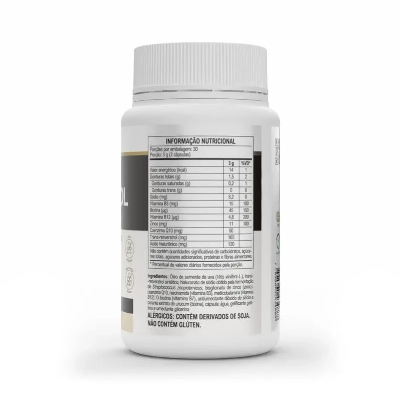 Este suplemento alimentar é formulado à base de óleo de semente de uva (Vitis vinifera L.) e enriquecido com trans-resveratrol, ácido hialurônico, coenzima Q10, vitaminas B3 e B12, biotina e zinco. Sua composição combina antioxidantes, vitaminas e minerais essenciais para complementar a nutrição diária. Cada porção fornece 165 mg de trans-resveratrol, 120 mg de ácido hialurônico e 50 mg de coenzima Q10. Apresenta-se em cápsulas softgel, é zero açúcares e não contém glúten.