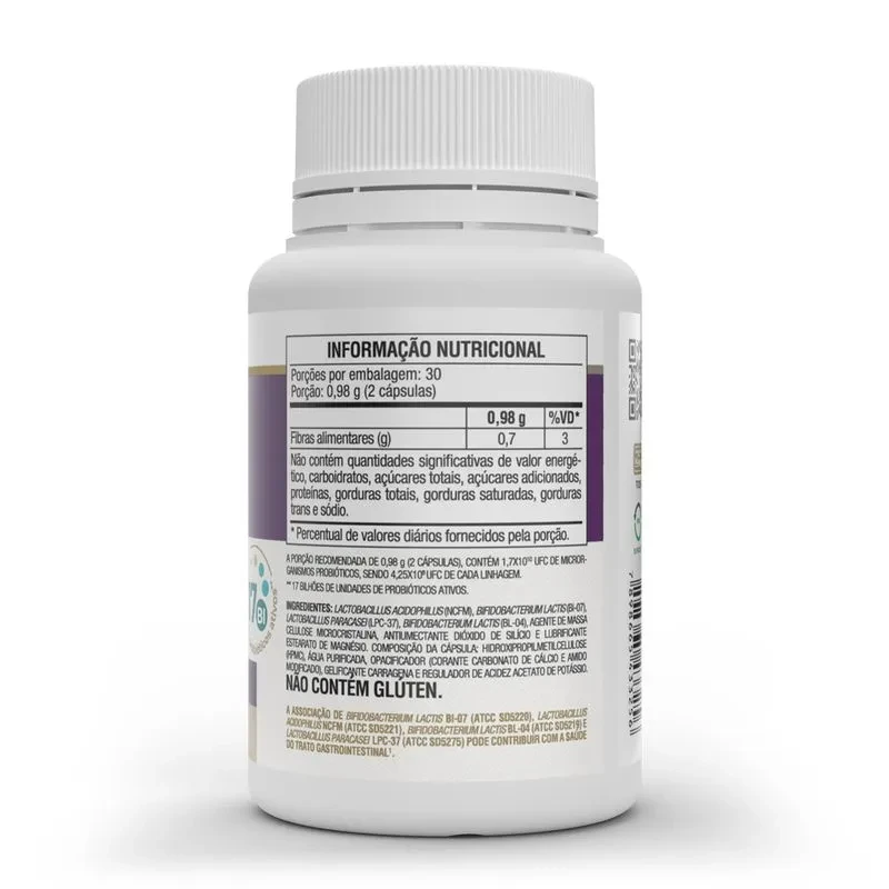 Lactobacillus acidophilus (NCFM), Bifidobacterium lactis (BI-07), Lactobacillus paracasei (LPC-37), Bifidobacterium lactis (BL-04), agente de massa celulose microcristalina, antiumectante dióxido de silício e lubrificante estearato de magnésio.Composição da cápsula: hidroxipropilmetilcelulose (HPMC), água purificada, opacificador (carbonato de cálcio e amido modificado), gelificante carragena e regulador de acidez acetato de potássio.
