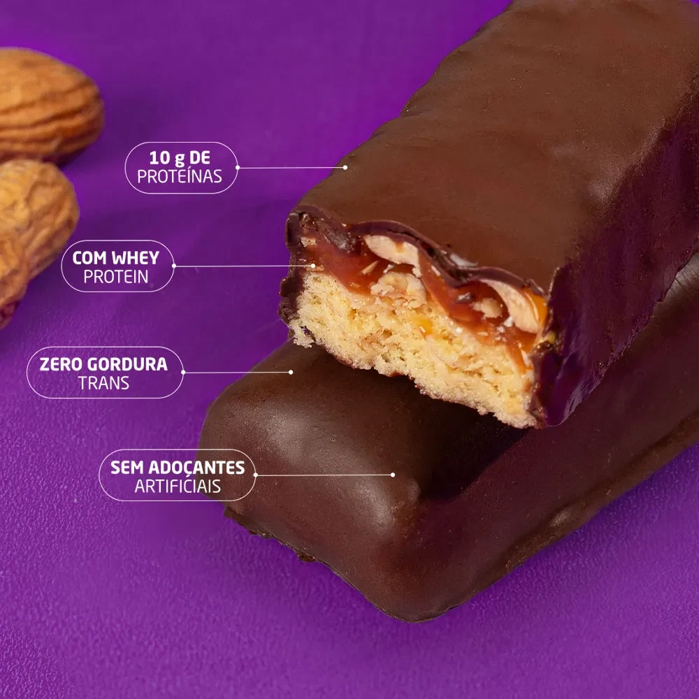 Blend proteico (caseinato de cálcio, proteína concentrada de leite, proteína de soro do leite concentrada, proteína de soro do leite isolada e colágeno hidrolisado), recheio de caramelo, amendoim torrado, cobertura sabor chocolate meio amargo, óleo de palma (Elaeis guineenses), polidextrose, pasta de amendoim, frutooligossacarídeos (FOS), cloreto de sódio, edulcorantes maltitol e sorbitol, umectante glicerol, antiumectante fosfato tricálcico, emulsificantes goma acácia e lecitina de soja, aromatizantes, conservantes sorbato de potássio e benzoato de sódio e antioxidante Dl-alfa-tocoferol.