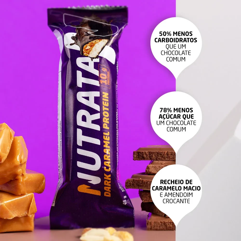 A Barra de Proteína Nutrata Caramel foi desenvolvida para transformar o momento do lanche em uma experiência mais prazerosa, sem abrir mão da praticidade. Sua combinação de chocolate, caramelo e amendoim oferece um sabor marcante e uma textura que mistura cremosidade e crocância. É uma alternativa para quem deseja substituir doces tradicionais por uma opção com perfil nutricional diferenciado, ideal para diferentes momentos da rotina.