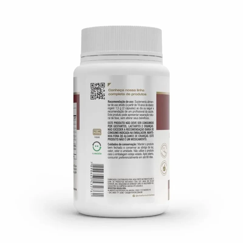 Ingerir 1,5 g (2 cápsulas) ao dia ou seguir a recomendação de um profissional da saúde. Este produto pode apresentar separação natural de fase, sem alterar seus benefícios.