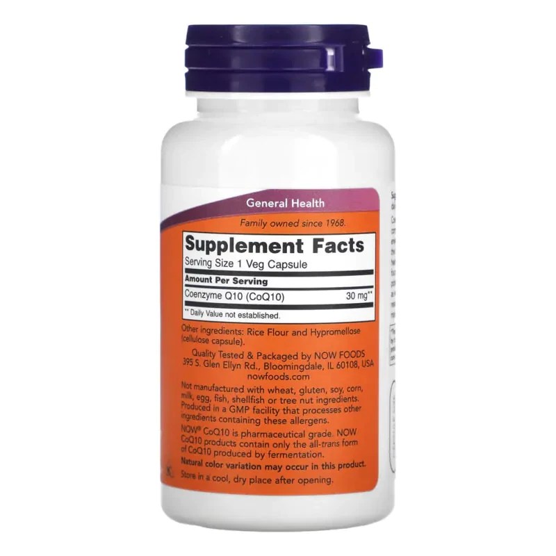 O CoQ10 30mg Now Foods é um suplemento que fornece a Coenzima Q10 (Ubiquinona) em alta pureza. A CoQ10 é vital para a produção de energia (ATP) nas mitocôndrias das células.