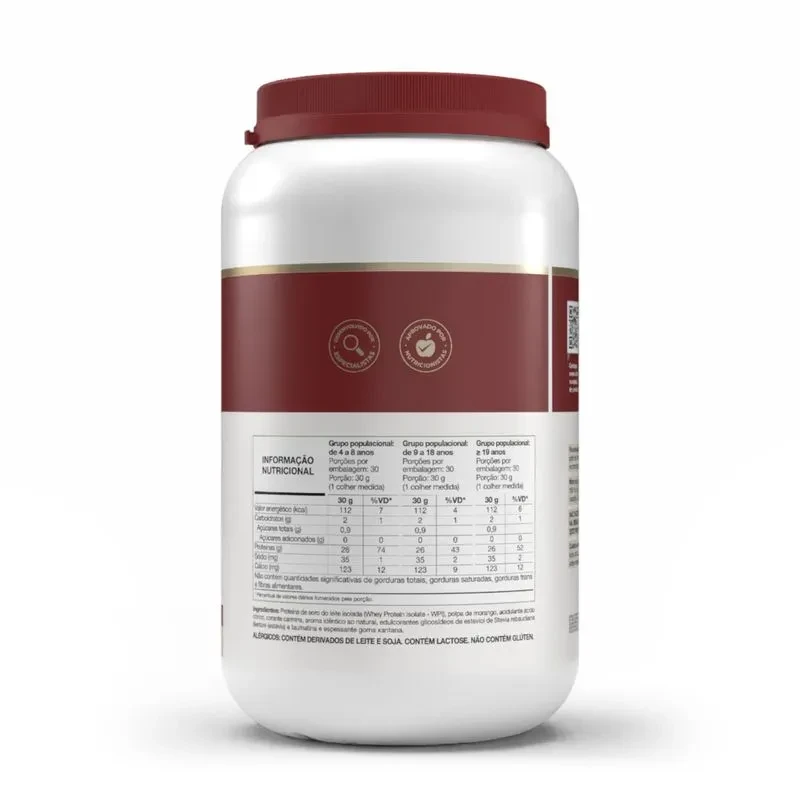 Proteína de soro do leite isolada (Whey Protein Isolate – WPI), polpa de morango, acidulante ácido cítrico, corante carmins, aroma idêntico ao natural, edulcorantes glicosídeos de esteviol de *Stevia rebaudiana bertoni* (estévia) e taumatina e espessante goma xantana.