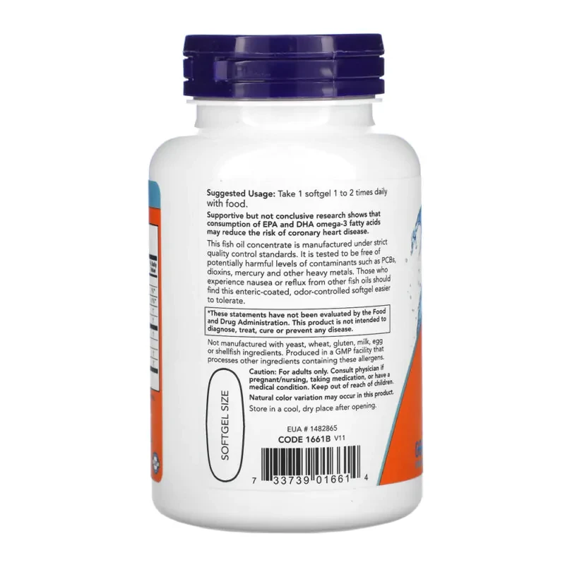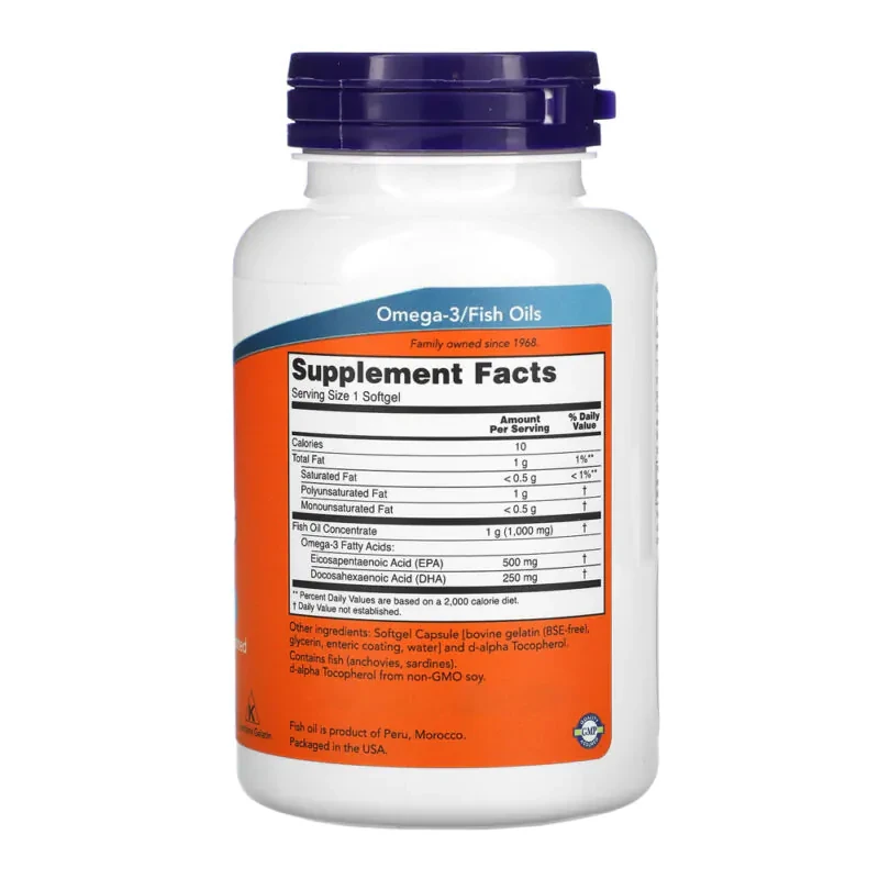 O Ultra Ômega 3 500 EPA 250 DHA 90 Cápsulas NOW Foods apresenta 500mg de EPA e 250mg DHA destilado molecularmente e revestimento entérico das cápsulas.