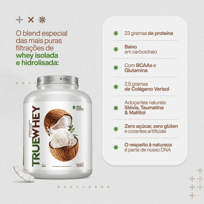 O True Whey Coconut Ice Cream foi desenvolvido para quem busca uma fonte de proteína de alto valor biológico aliada a ingredientes selecionados e sabor diferenciado. Seu blend de whey protein isolado e hidrolisado proporciona absorção eficiente e excelente aproveitamento nutricional, auxiliando no aporte diário de proteínas na alimentação.O sabor Coconut Ice Cream traz o toque suave e agradável do coco, um ingrediente muito apreciado na culinária brasileira. A combinação de leite de coco em pó, coco ralado e ingredientes naturais proporciona uma experiência saborosa e versátil, que pode ser consumida tanto pura quanto em preparações como vitaminas, shakes e receitas proteicas.