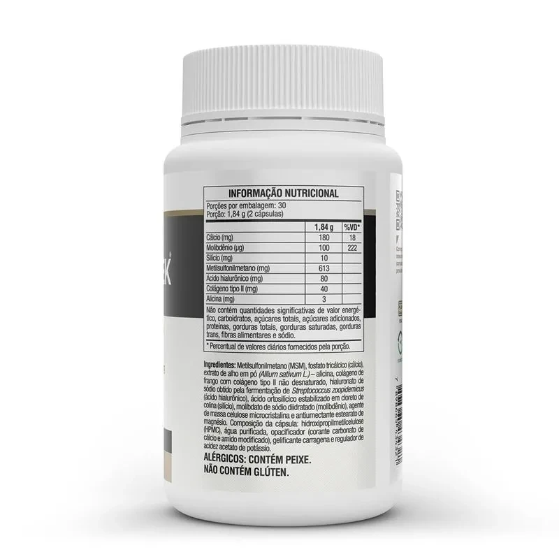 Metilsulfonilmetano (MSM), fosfato tricálcico (cálcio), extrato de alho em pó (Allium sativum L.), alicina, colágeno de frango com colágeno tipo II não desnaturado, hialuronato de sódio obtido pela fermentação de Streptococcus zoopidemicus (ácido hialurônico), ácido ortosilícico estabilizado em cloreto de colina (silício), molibdato de sódio diidratado (molibdênio), agente de massa celulose microcristalina e antiumectante estearato de magnésio.