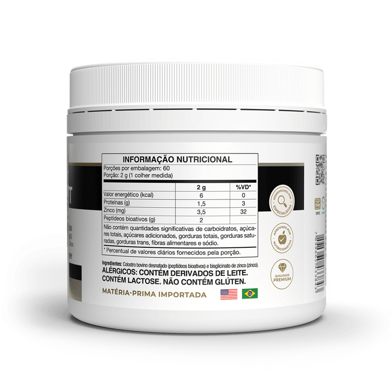 Colostro bovino desnatado (peptídeos bioativos) e bisglicinato de zinco (zinco).