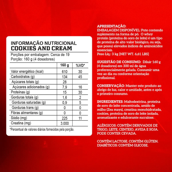 A composição reúne fontes de energia rápida, como a maltodextrina, além de proteínas do soro do leite concentrada e isolada. O produto também contém creatina monohidratada, ingrediente amplamente utilizado por praticantes de atividades físicas que buscam melhorar o desempenho durante os treinos.