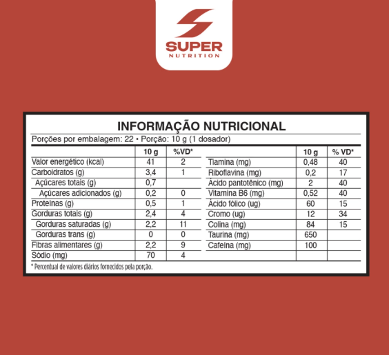 Sua composição reúne triglicerídeos de cadeia média (TCM), taurina, colina, vitaminas do complexo B e cromo, que atuam em sinergia para apoiar o metabolismo energético e o desempenho ao longo do dia. Além disso, é um produto sem adição de açúcar, adoçado com estévia, com baixas calorias e fácil dissolução.