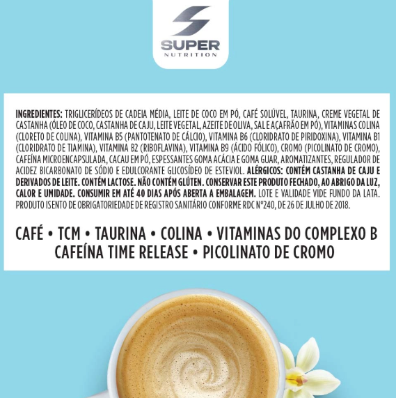 Triglicerídeos de cadeia média, leite de coco em pó, café solúvel, taurina, creme vegetal de castanha (óleo de coco, castanha de caju, leite vegetal, azeite de oliva, sal e açafrão em pó), colina (cloreto de colina), vitamina B5 (pantotenato de cálcio), vitamina B6 (cloridrato de piridoxina), vitamina B1 (cloridrato de tiamina), vitamina B2 (riboflavina), vitamina B9 (ácido fólico), cromo (picolinato de cromo), cafeína microencapsulada, cacau em pó, espessantes goma acácia e goma guar, aromatizantes, regulador de acidez bicarbonato de sódio e edulcorante glicosídeo de esteviol.