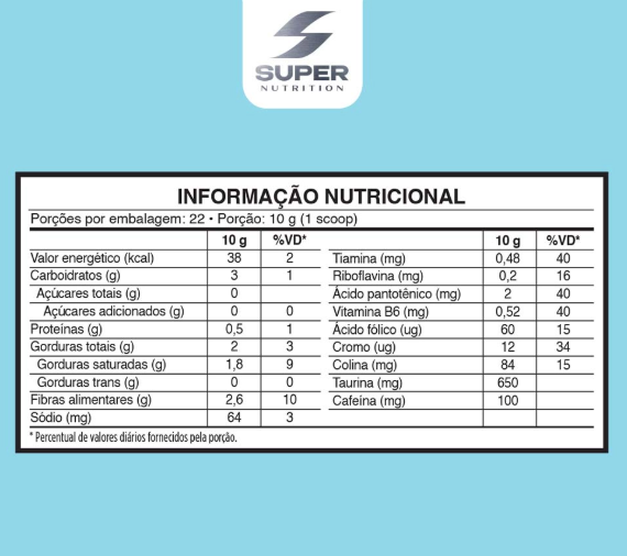 Sua composição inclui triglicerídeos de cadeia média (TCM), taurina, colina, vitaminas do complexo B e cromo, que atuam em conjunto para apoiar o metabolismo energético e o desempenho diário. Além disso, é um produto sem adição de açúcar, adoçado com estévia, com baixas calorias e fácil dissolução.