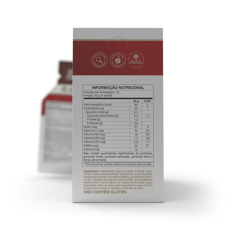 Maltodextrina, água, D-frutose, D-ribose, cafeína, cacau em pó, ácido ascórbico (vitamina C), cloreto de sódio, levedura enriquecida com selênio (selênio), niacinamida (vitamina B3), cloridrato de piridoxina (vitamina B6), cianocobalamina (vitamina B12), acidulantes citrato de sódio, citrato de potássio e ácido cítrico, aroma idêntico ao natural de mocha e conservantes sorbato de potássio e benzoato de sódio.NÃO CONTÉM GLÚTEN.