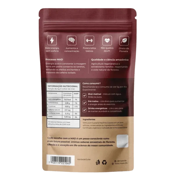 O Guaraná Cipó MAD é cultivado de forma orgânica no coração da floresta amazônica, em sistemas agroflorestais que preservam o equilíbrio do ecossistema. Esse modelo de produção garante um produto autêntico, obtido com respeito ao meio ambiente e aos ciclos naturais da floresta.