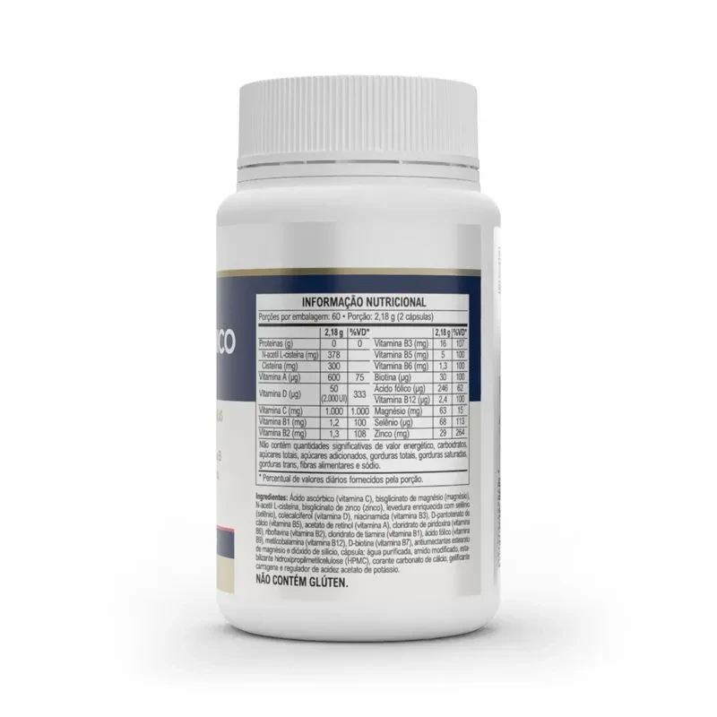 Ácido ascórbico (vitamina C), N-acetil L-cisteína, bisglicinato de magnésio (magnésio), bisglicinato de zinco (zinco), levedura enriquecida com selênio (selênio), colecalciferol (vitamina D), niacinamida (vitamina B3), D-pantotenato de cálcio (vitamina B5), acetato de retinol (vitamina A), cloridrato de piridoxina (vitamina B6), riboflavina (vitamina B2), cloridrato de tiamina (vitamina B1), ácido fólico (vitamina B9), metilcobalamina (vitamina B12), D-biotina (vitamina B7) e antiumectantes estearato de magnésio e dióxido de silício. Composição da cápsula: hidroxipropilmetilcelulose (HPMC), água purificada, opacificador (corante carbonato de cálcio e amido modificado), gelificante carragena e regulador de acidez acetato de potássio.Não contém glúten.
