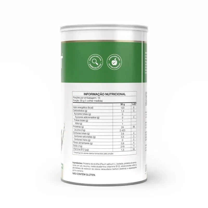 Proteína de ervilha (Pisum sativum L.) isolada, proteína de arroz, cacau em pó, leucina, metilcobalamina (vitamina B12), edulcorantes xilitol e glicosídeos de esteviol (estévia) e espessante goma xantana.