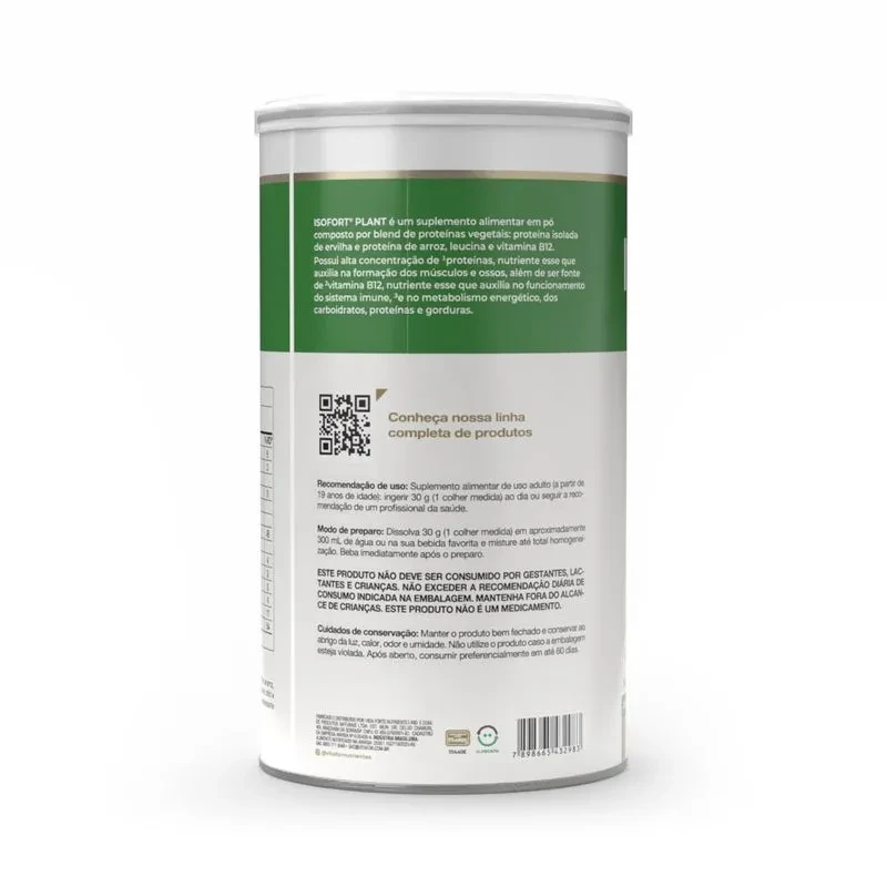 O Isofort® Plant é um suplemento alimentar em pó formulado com um blend de proteínas vegetais, composto por proteína isolada de ervilha e proteína de arroz, associado à L-leucina e à vitamina B12. Com alta concentração proteica, fornece 24 g de proteína por porção, sendo uma excelente alternativa para complementar a ingestão diária desse nutriente.