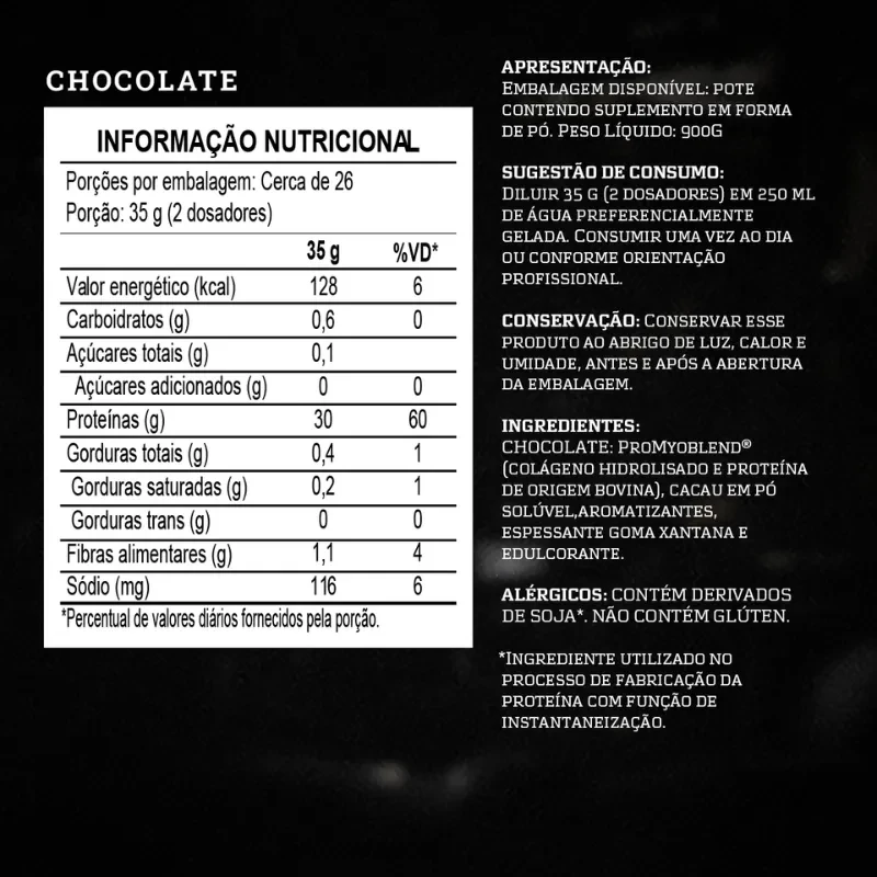 ProMyoblend® (colágeno hidrolisado e proteína de origem bovina), cacau em pó solúvel, aromatizantes, espessante goma xantana e edulcorante.