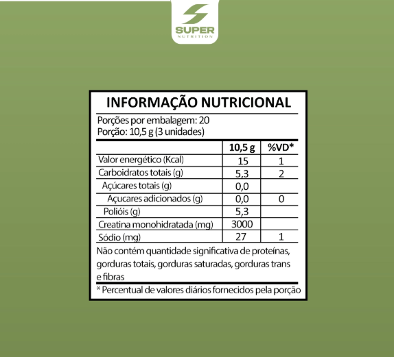 Livre de glúten, lactose, gorduras e sem adição de açúcares, é uma opção moderna para quem busca incluir a creatina na rotina de forma simples e eficiente. Além disso, não possui corantes artificiais e é formulada sem substâncias proibidas.