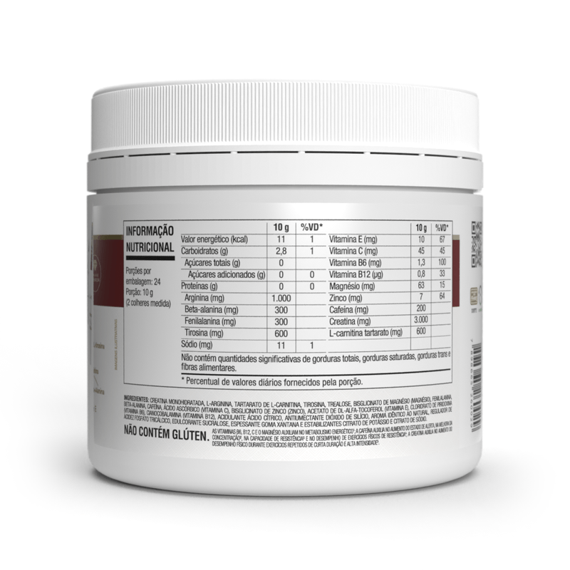 Creatina monohidratada, L-arginina, L-carnitina L-tartarato, L-tirosina, trealose, bisglicinato de magnésio (magnésio), L-fenilalanina, beta-alanina, cafeína, ácido ascórbico (vitamina C), bisglicinato de zinco (zinco), acetato de DL-alfa-tocoferol (vitamina E), cloridrato de piridoxina (vitamina B6), metilcobalamina (vitamina B12), acidulante ácido cítrico, antiumectante dióxido de silício, aroma idêntico ao natural, regulador de acidez fosfato tricálcico, edulcorante sucralose, espessante goma xantana e estabilizantes citrato de potássio e citrato trissódico.NÃO CONTÉM GLÚTEN.
