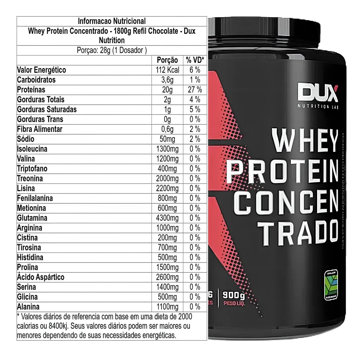 O Whey Protein Concentrado DUX é uma proteína 100% pura, cuidadosamente extraída do soro do leite, sem blends ou adição de outras proteínas. Ele passa por um rigoroso processo de filtragem, tornando-se uma fonte altamente absorvível de aminoácidos essenciais.